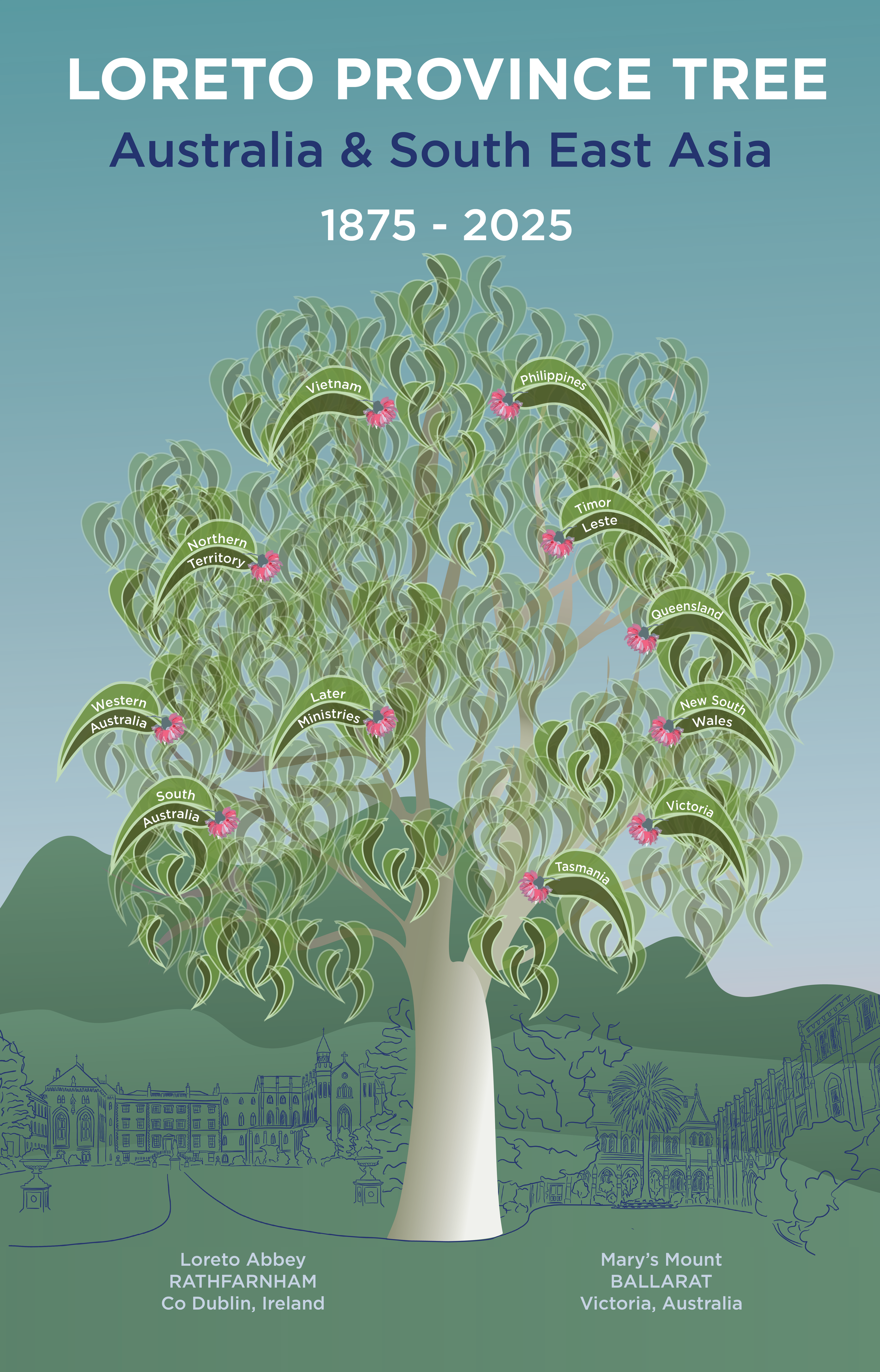 Fast forward to the present day, and we have reimagined this artwork in a contemporary context. The ‘Province Tree’ features all the places across the Australia and South East Asia province where Loreto Sisters have established schools and ministries over the past 150 years.